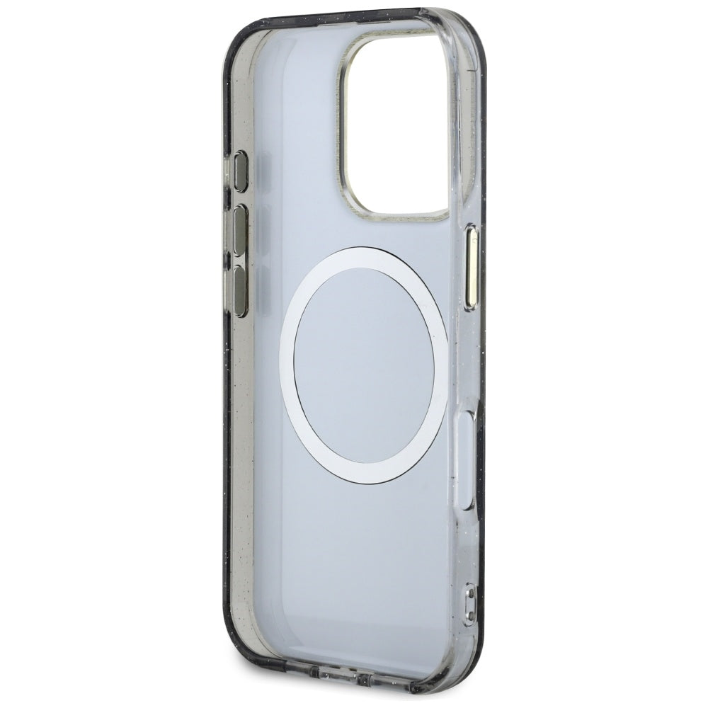MagSafe Case for Apple iPhone 16 Pro, Guess, IML Metal Glitter Flowers Triangle, Black