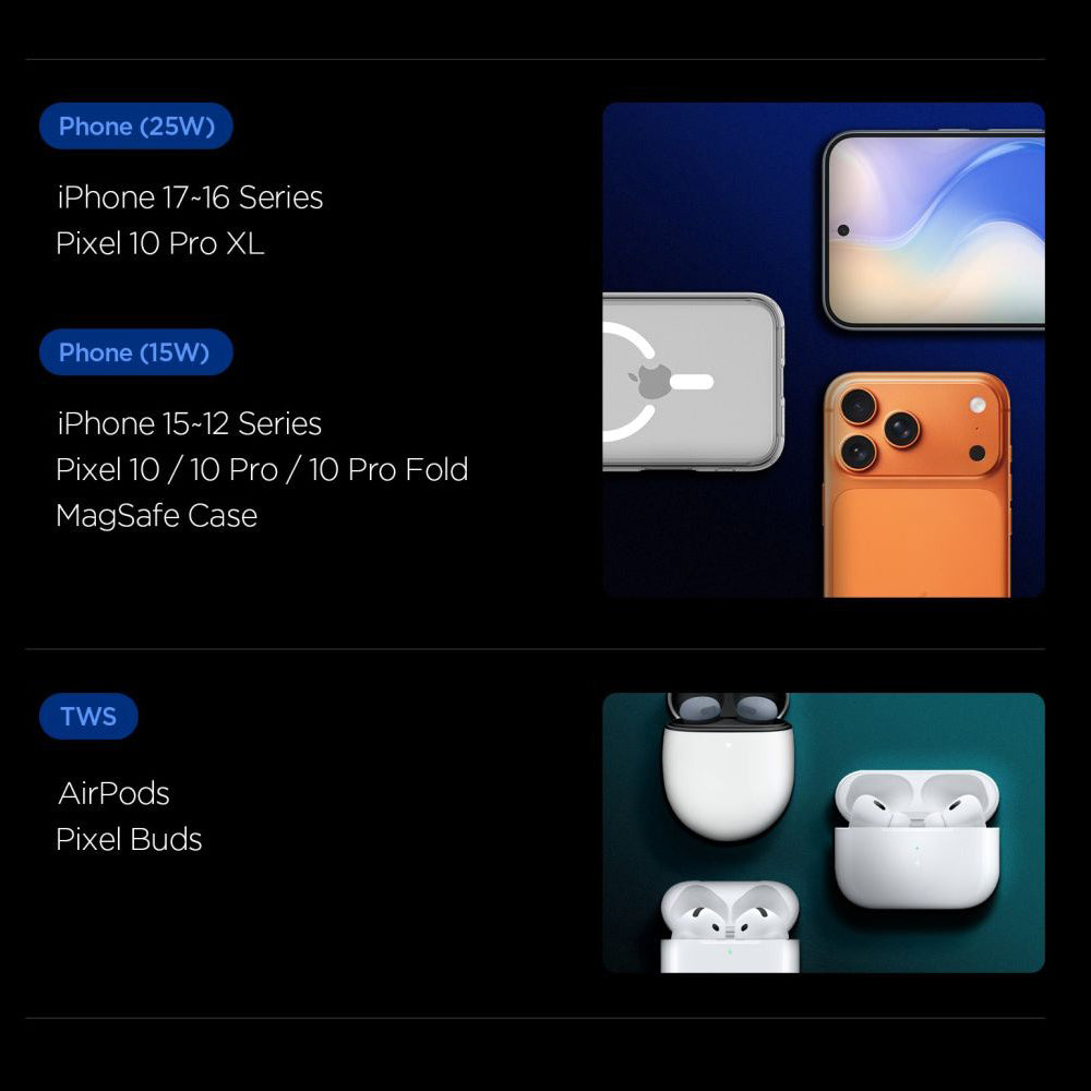 • Compatibility: MagSafe compatible devices, Android phones with Qi2.2 standard, True Wireless headphones with Qi wireless charging, any gadget that can connect to the side USB-C port.