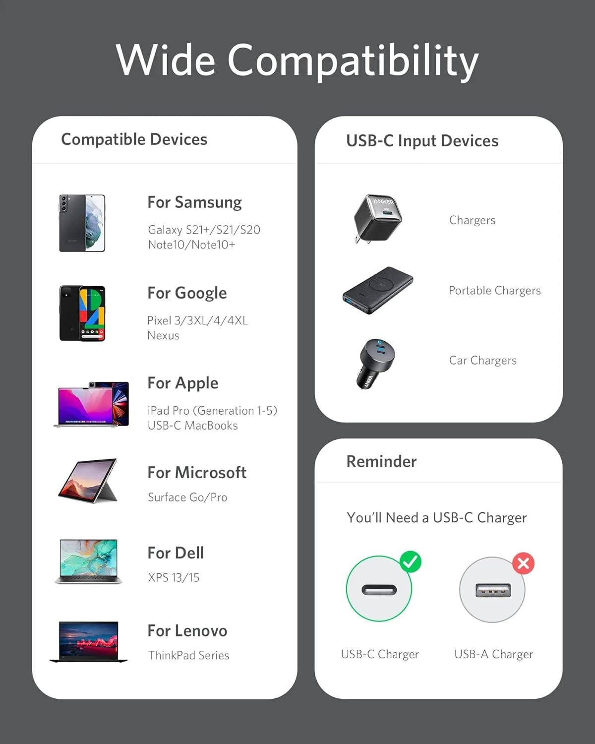 - Compatibility: USB-C phones, tablets, and laptops