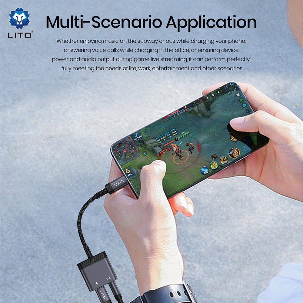 De Lito LA04T audio adapter stelt je in staat om naar muziek te luisteren met je 3.5mm koptelefoon en tegelijkertijd je telefoon of tablet op te laden via USB-C,